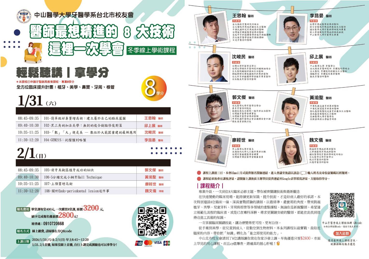 【本會 年度線上 學術演講 2025-10-18 ~ 19 】已結束! 【本會 春季線上 學術演講 2025-04-12 ~ 13 】已結束! 【本會 年度線上 學術演講 2024-10-19 ~ 20 】已結束! 【本會 線上 學術演講 2024-06-15 ~ 16 】 已結束 【本會 線上 學術演講 2024-01-06 ~ 07 】 已結束 【本會 線下實體 國際學術演講 2023-08-27】已結束 【臺北市中山牙醫會 學術演講 2023-0610-11】已結束 【臺北市中山牙醫會 學術演講 2023-0218-19】已結束 【臺北市中山牙醫會 學術演講 2022-1015-16】已結束 【徵求2022/10/15~16學術演講 論文貼示報告】已結束 【臺北市中山牙醫會 學術演講 2022-0514-15】已結束 【臺北市中山牙醫會 學術演講 2022-0219-20】已結束 【臺北市中山牙醫會 學術演講 2021-1204-05】已結束 【臺北市中山牙醫會 學術演講 2021-1023-24】已結束 【臺北市中山牙醫會 學術演講 2021-0925-26】已結束 【臺北市中山牙醫會 學術演講 2021-0717-18】已結束 【臺北市中山牙醫會 學術演講 2021-0515-16】已結束 【臺北市中山牙醫會 學術演講 2021-0206-07】已結束 【本會 1123 釣蝦活動 2025-11-23 花絮】 已結束 【本會 0907 Cowell演講 2025-09-07 花絮】 已結束 【本會 0518 漆彈大戰 2025-05-08 花絮】 已結束 【本會 0502 安妮怎麼了活動 2025-05-02 花絮】 已結束 【本會 1222 品酒會尾牙活動 2024-12-22 花絮】 已結束 【本會 0707 釣蝦活動 2024-07-07 花絮】 已結束 【臺北市中山牙醫會 2023-10-15 保齡球聯誼賽】已結束 【臺北市中山牙醫會 2023-03-12 北投走春去】已結束 【臺北市中山牙醫會 2022-10-16 第10屆第1次會員大會】 【臺北市中山牙醫會 20220917-18 六福村旅遊】已結束 【臺北市中山牙醫會 2022-07-24 一起來釣蝦】已結束 【臺北市中山牙醫會 20211211-12 大板根旅遊】已結束 【臺北市中山牙醫會 2021-11-07 一起來釣蝦】已結束 【臺北市中山牙醫會 2021-10-24 第9屆第2次會員大會】 【臺北市中山牙醫會 2021-02-21 貴子坑健行】已結束 【藏經閣 網路繼續教育課程】 報名中!